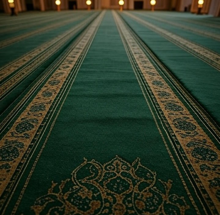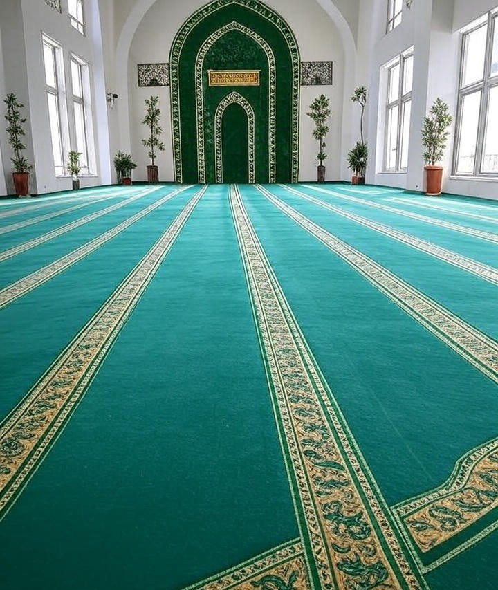 • Sesuaikan Warna: Pilih warna karpet yang serasi dengan interior masjid, biasanya hijau, merah, atau biru.